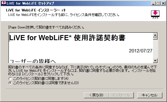 「このライセンス契約書に同意します」を選択し、「インストール」で進む。