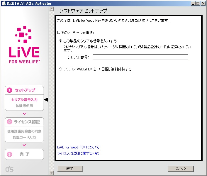 24桁のシリアル番号を入力して、「次へ」で進みます。